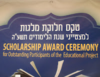There were two unexpected things that really impressed me at the ceremony. They were the praise and support for both the surviving/single parents and the tutors. I really liked the fact that the organizers of this project seemed genuinely close to the students and their families.And as you can see from all of the photos, the recipients are not Chabadniks. And not all even appeared to be religious Jews. The students in the program are all tested every year, and those who get the best scores get this additional award.